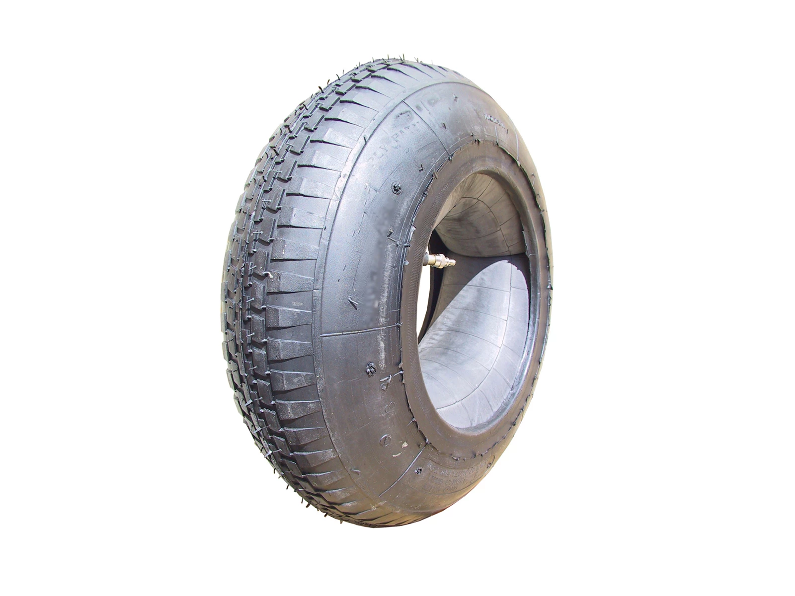 Detta kraftfulla skottkärrdäck är designat med ett mindre vredmönster. Däcket har en slang och slangen är utrustad med en rak autoventil.